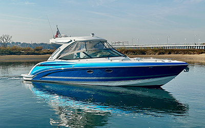 Upgraded engine package with 300hp MerCruiser I/O-Bravo III drives. Fitted with all the creature comforts and striking red hull